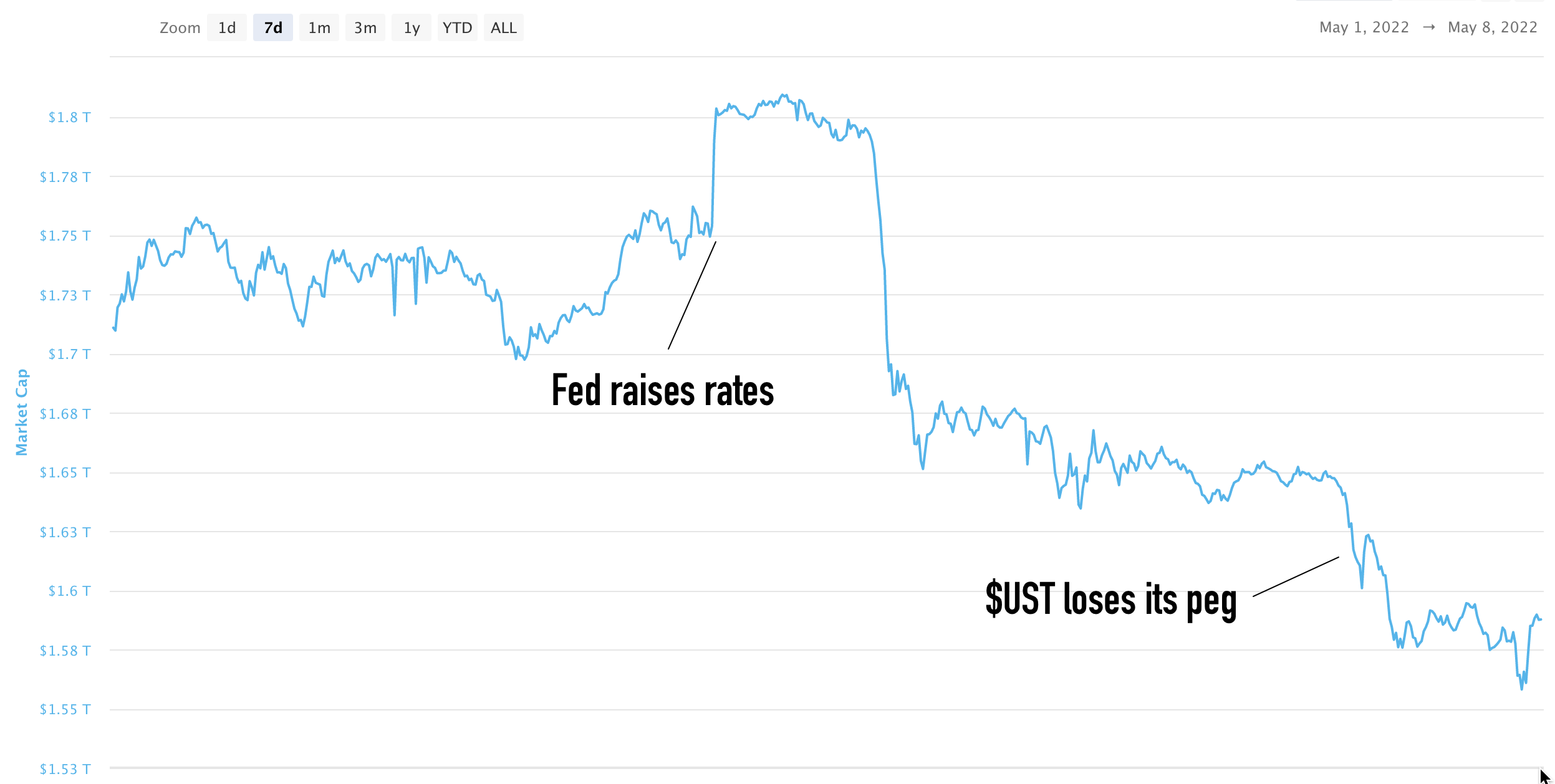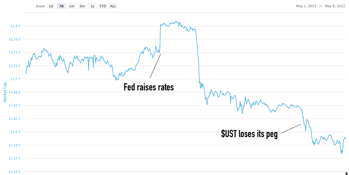 The bad news hitting crypto over the last 24 hours has to do with an algorithmic stablecoin called TerraUSD (UST), which on Saturday began to lose its peg to the dollar and is still fighting to get it back.